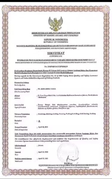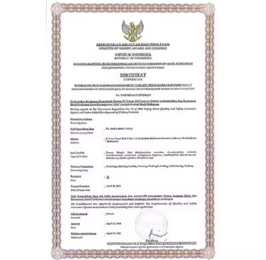 All export products come with valid Health Certificates from the Indonesian Fisheries Authority.